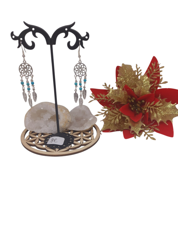 Les boucles d'oreilles attrape-rêves en turquoise en argent et doré sont absolument magnifiques et pleines de charme. La turquoise, avec sa couleur apaisante et vibrante, évoque la sérénité et la protection, tandis que la conception attrape-rêves leur donne une touche bohème et spirituelle. L'argent ajoute une élégance discrète et raffinée, mettant en valeur la beauté naturelle de la pierre. Ces boucles d'oreilles sont parfaites pour celles qui aiment un style à la fois ethnique et sophistiqué, tout en portant une pierre aux propriétés positives.